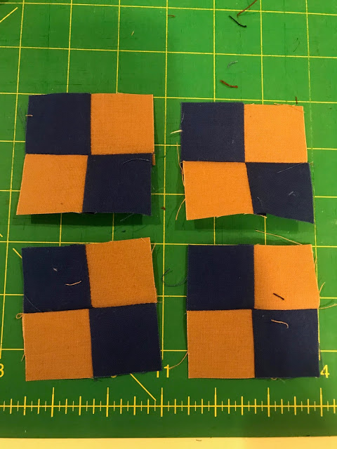 From your brown/tan and maroon (we used both of these colors in part 1) cut 1 1/2" strips to equal 27" (or a little longer) Or feel free to cut squares like I did above. If you've made strips, sub cut like in part 1.
